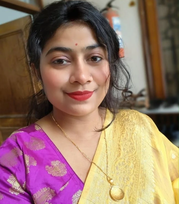 এবার ভাল করে চেয়ে দেখলাম পমিদিকে। আমার চাইতে লম্বা, প্রায় পাঁচ ফুট পাঁচ ইঞ্চি, গায়ের রঙ আমার মত দুধে-আলতা নয়, বরং একটু পোড়া তামাটে রঙের, ইংরাজীতে যাকে ট্যান্-স্কিন বলে। ঘাড় অব্দি ঢেউখেলানো শর্ট স্টেপ কাট চুল, ধারালো চিবুক, টিকালো নাক আর সেই সাথে ঝকঝকে উজ্জ্বল চোখ। পরনে টিয়াপাখি রঙের জমকালো সিল্কের শাড়ী আর সেই সাথে ম্যাচিং স্লিভলেস ব্লাউস। হাতদুটো সাপের ফনার মত উন্মুক্ত হয়ে আছে কাঁধের আঁচল থেকে। শাড়ী যে ঐরকম আকর্ষণীয় ভাবে পরা যায় ওনাকে দেখার আগে আমার ধারণা ছিল না, গোটা শাড়ীটা যেন ওনার শরীরে টানটান হয়ে পেঁচিয়ে ধরে আছে, নাভির নীচে শাড়ী পরায় ব্লাউজের নীচ থেকে পেটের অনেকটা অংশ উন্মুক্ত। আঁচলটা এমনভাবে ঘুরিয়ে উপর দিয়ে গেছে যে নাভিটা আঁচলে ঢাকা পরেনি। সরু কোমরের নীচে তলপেটের মাঝে নাভিতে লাগানো পাথর বসানো সোনার ন্যাভাল-রিং-টা আলোয় চকচক করছে। টাইট ব্লাউজের নীচে ন্যাসপাতির মত সুডৌল বুকদুটো আঁচলের পাশ থেকে নিজেদের অস্তিত্ব জানান দিচ্ছে। পায়ে গ্লেজ চামড়ার স্টিলেটো। সারা দেহে যৌবন, যৌনতা আর এক সন্মোহনী সৌন্দর্য যেন খেলে বেড়াচ্ছে।