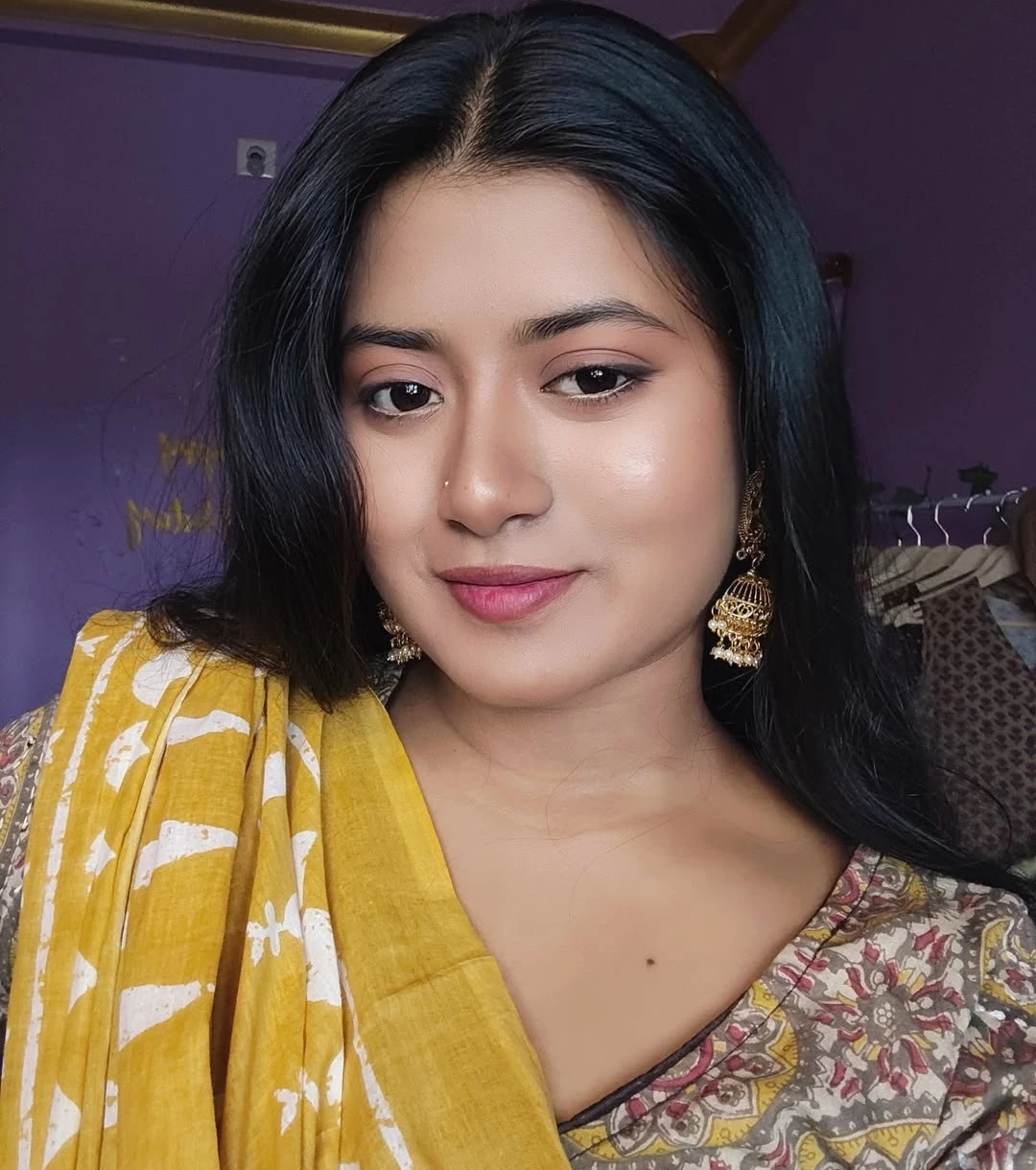 হালকা হলুদ সারি, তাতে কাজ করা আছে, হাতে কিছু সুন্দর চুড়ি, লাল লিপস্টিক আর কানে হালকা হলুদ দুল, আরো কত রকমের কিছু করেছে যা আমি জানি না হয়তো।
